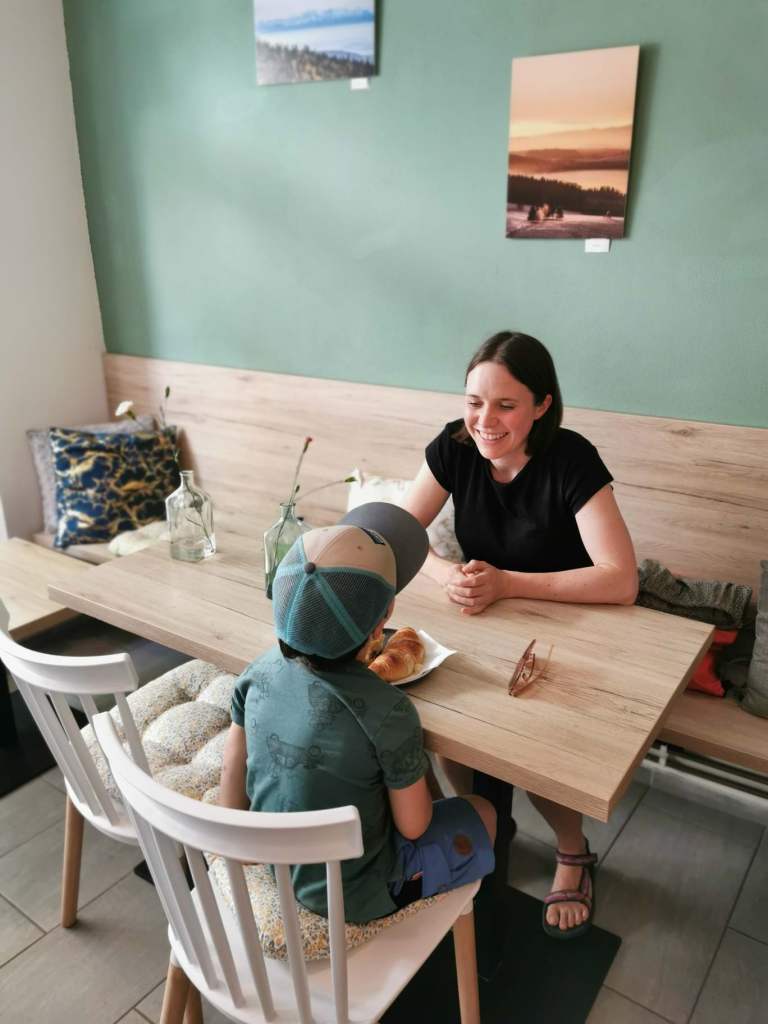 Obwohl wir das Boot und die Stühle abends schon verstaut haben, kommen wir mit Zampacken, Entsorgen und Co erst um halb 12 los, und das sogar ohne Frühstück. Dafür fahren wir aber auch nur in den nächsten Ort, weil ich dort via Google ein wunderschönes kleines Bistro rausgesucht hatte und unbedingt dort essen wollte. Gesagt, getan. Wir sitzen drinnen und schlemmen uns sozusagen einmal durch die Speisekarte. So lecker und so schön hergerichtet das Essen. Es gibt auch wieder eine gut ausgestattete Spieleecke, die zumindest zeitweise gerne genutzt wird und etwas Ruhe bringt.