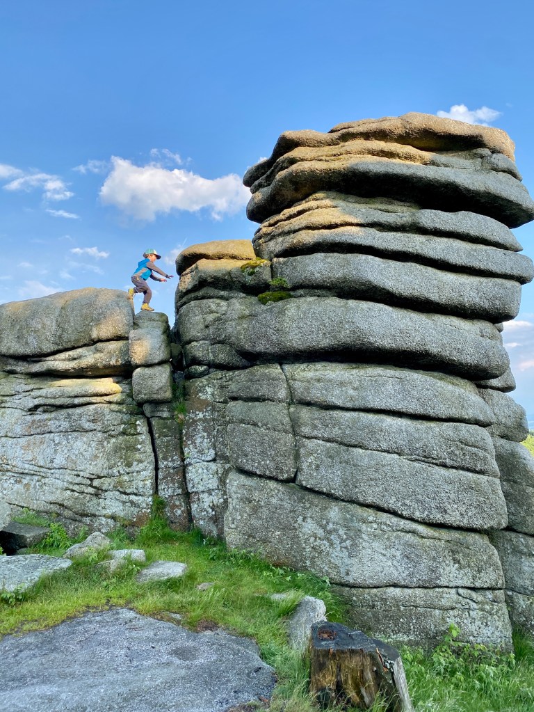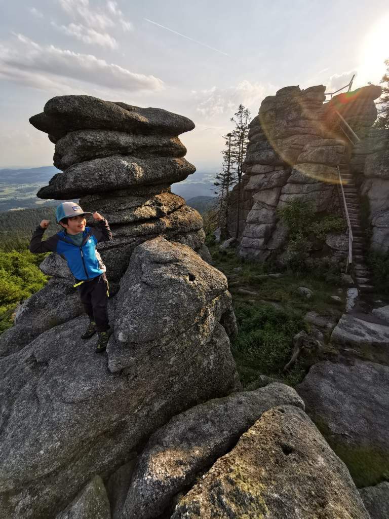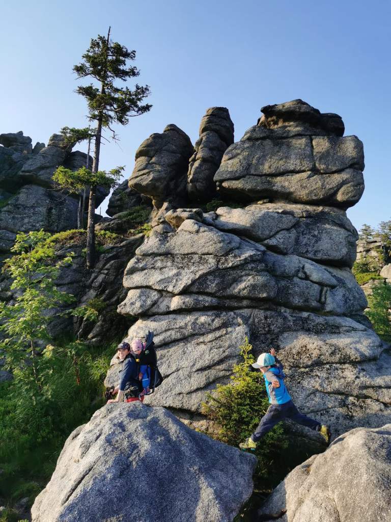Wir erkunden den Parkplatz, spielen ein bisschen mit den Hagelkörnern und gehen ein paar Meter den Berg hinauf. Komischerweise gibt es super viele Fliegen und noch schlimmer, ganz winzige ätzende Mücken, die leider sogar durch die Mückengitter und irgendwie auch durch die Scheiben kommen. Es wuselt auf jeden Fall an manchen Scheiben innen und da sie auch beißen ist das kein Spaß. Wir machen dennoch Abendessen drinnen und beschließen aber schon mal nicht hier oben zu übernachten. Dafür wollen wir aber nach dem Essen und Schauer aber noch eine Abendwanderung rauf zum Gipfel machen mit Elena in der Kraxe. Beste Idee! Vom Parkplatz aus ist es auch gar nicht weit und für Johannes super machbar. Die Kraxelfelsen sind auch genau sein Ding.