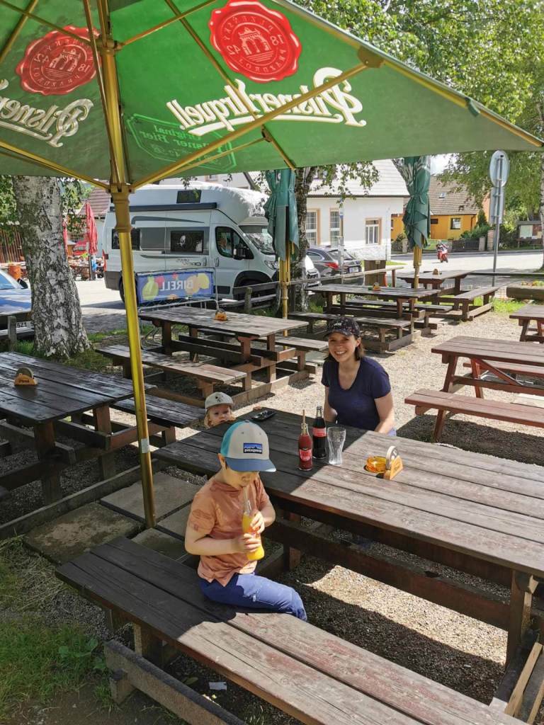 Die Sonne kommt bald heraus und in einem winzigen Ort bleiben wir spontan stehen, als wir einen kleinen Supermarkt entdecken und kehren mittags nebenan im Restaurant mit dem Spielplatz ein, allerdings ist das Essen leider nur mäßig. Dafür ist die Bedienung sehr nett und gibt sich wirklich große Mühe, die tschechische Speisekarte mit einer Liste zu übersetzen.