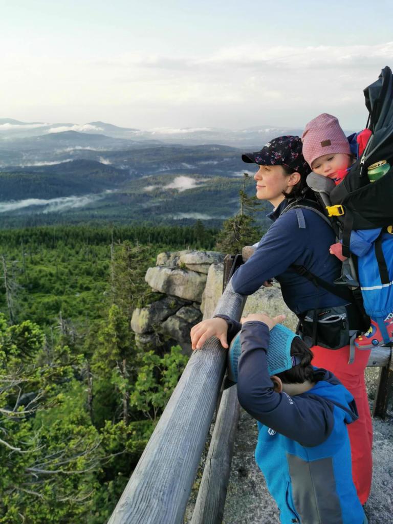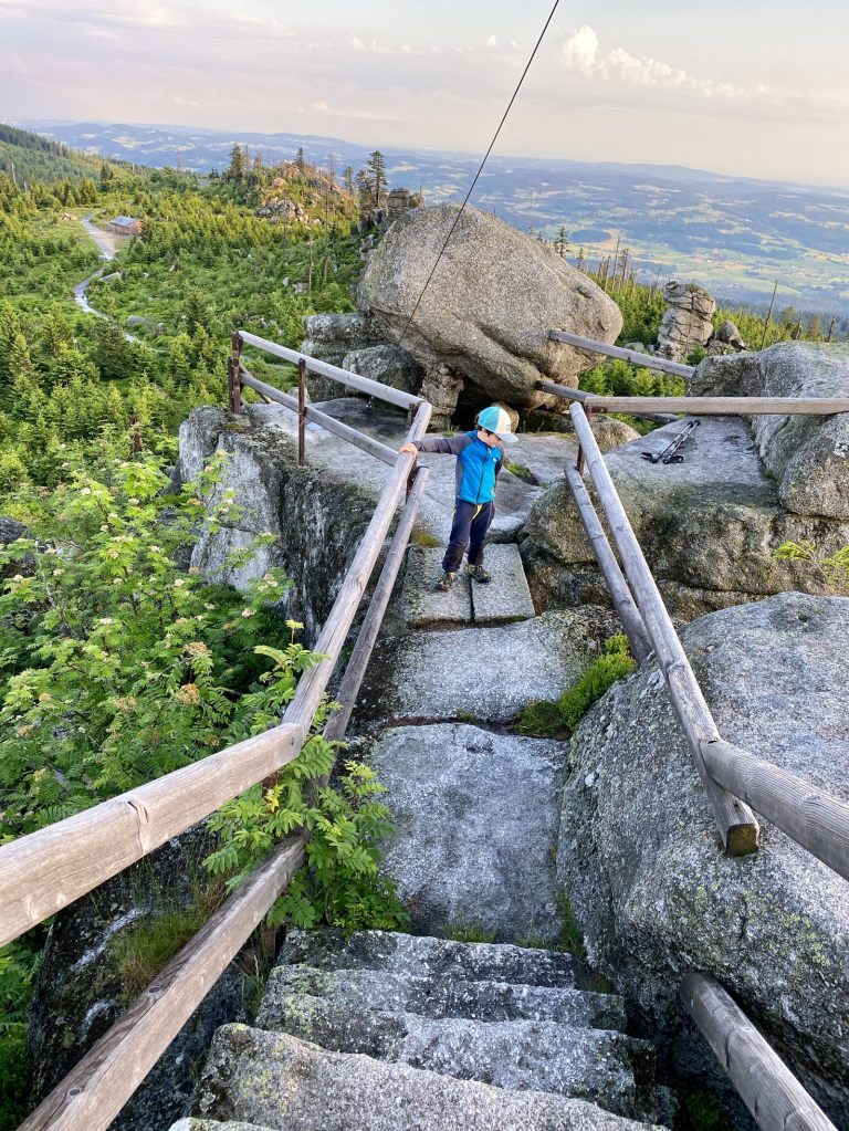 Schon beim Weiterfahren entlang des Sees in Richtung Dreisessel können wir die schwarzen Wolken sehen. Es sind schwere Gewitter für die Gegend angekündigt. Wir entkommen ihnen glücklicherweise fast komplett. Wir fahren eine kleine sehr schöne Straße, die uns sogar durch ein kleines Zipfelchen von Österreich führt. Kurz vorm Ziel lässt uns dann aber Google Maps im Stich, weil es uns zweimal eine Weile den Berg hochschickt, aber dann eine unzulässige Forst/Schotterstraße weiter nehmen will. So nervig! Beim zweiten Mal landen wir immerhin an einem Wanderparkplatz neben einem Spielplatz. Allerdings erwischt uns da der Rand eines Gewitterschauers mit starkem Regen und auch etwas Hagel, so dass wir im Auto bleiben und Kaffee kochen müssen. Nach dem Hagelschauer ist es auf jeden Fall zehn Grad kälter und die Luft ist total erfrischt und angenehm. Hätte schlimmer sein können und mit vereinten Kräften und Navis finden wir in der Pause immerhin die richtige Route zum Dreisessel Parkplatz heraus und starten sobald das Gewitter vorbei ist.