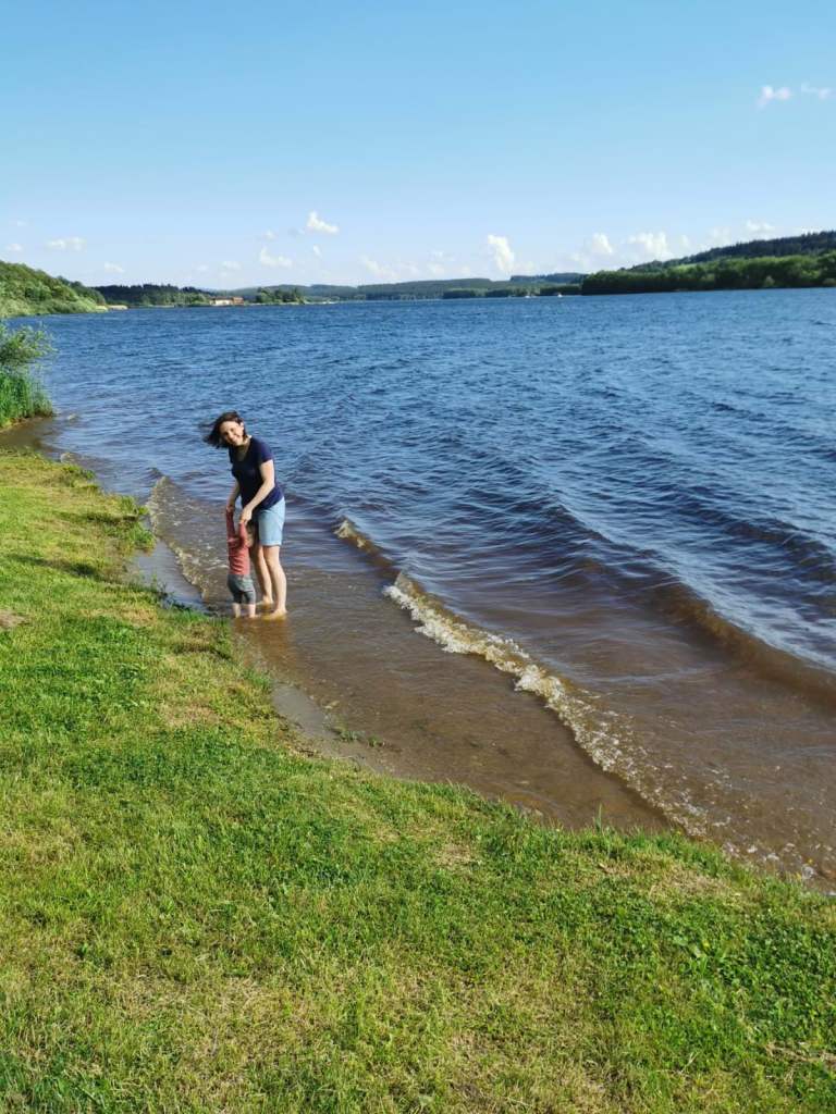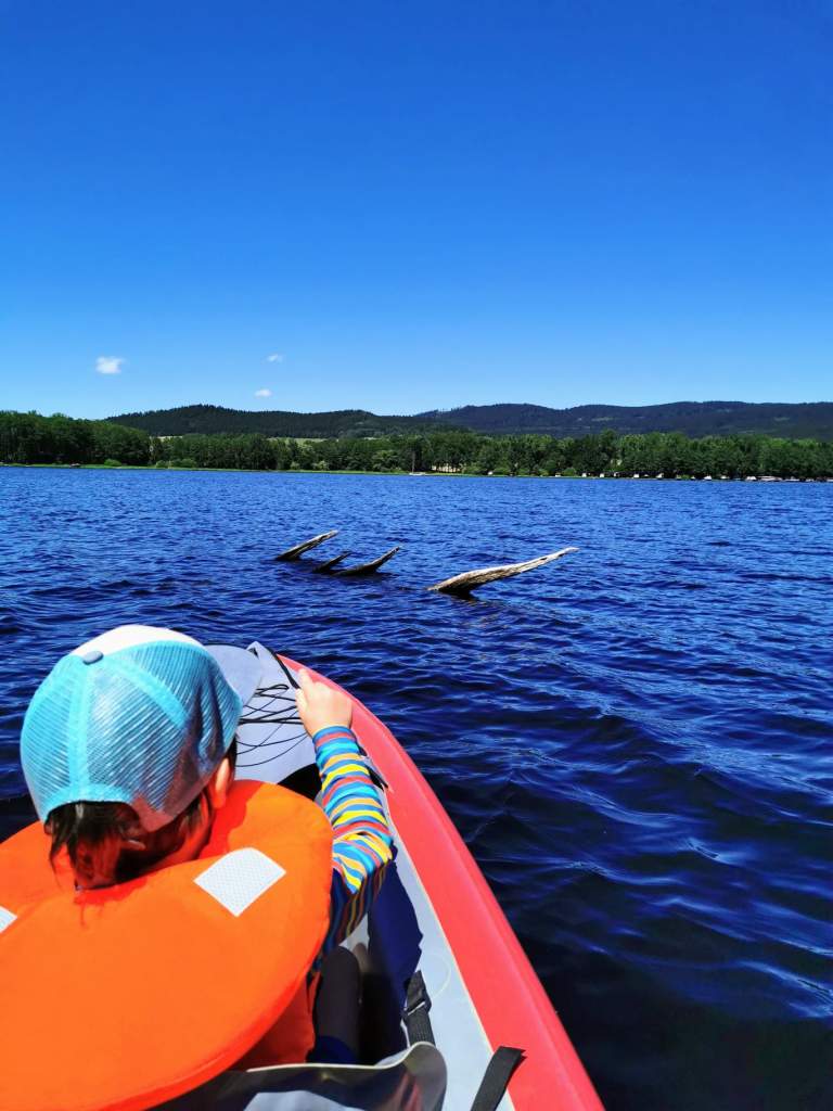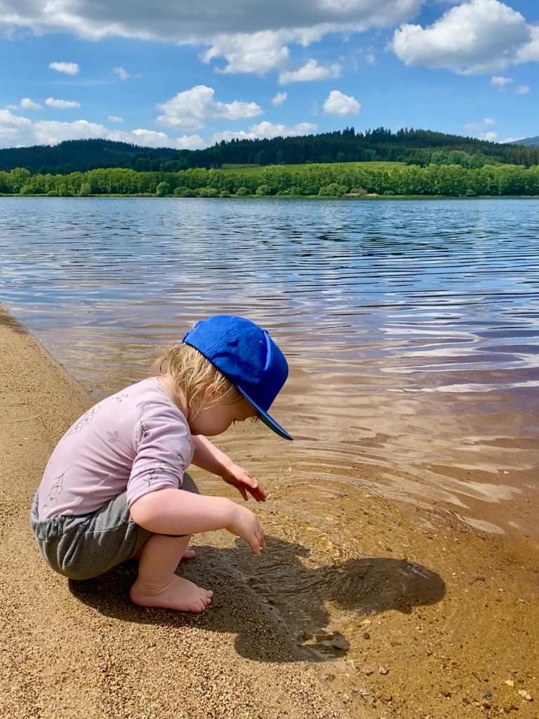 Ansonsten sind hier wirklich viele Deutsche und Österreicher, aber auch Tschechen. Es ist ein sehr schöner und top gepflegter Campingplatz. Wir bleiben drei Nächte: das Wetter ist schön, das Seewasser warm und schwedisch äh rotbräunlich gefärbt. Simon und Johannes sind viel mit unserem Boot auf dem Wasser unterwegs und Elena spielt derweil gern im Sand.