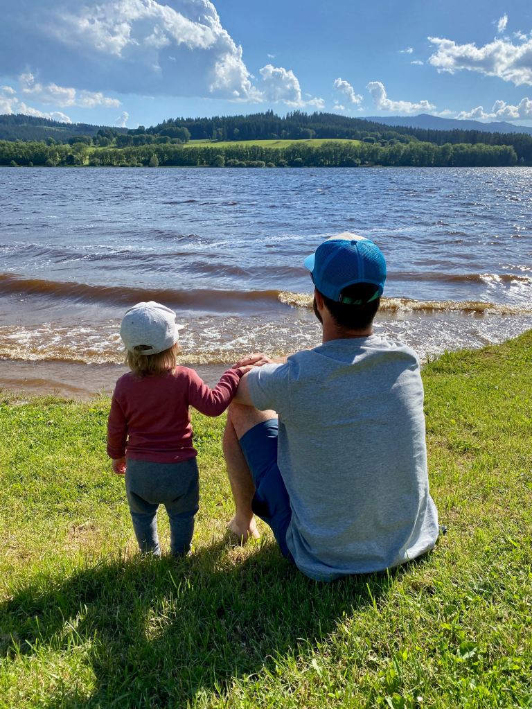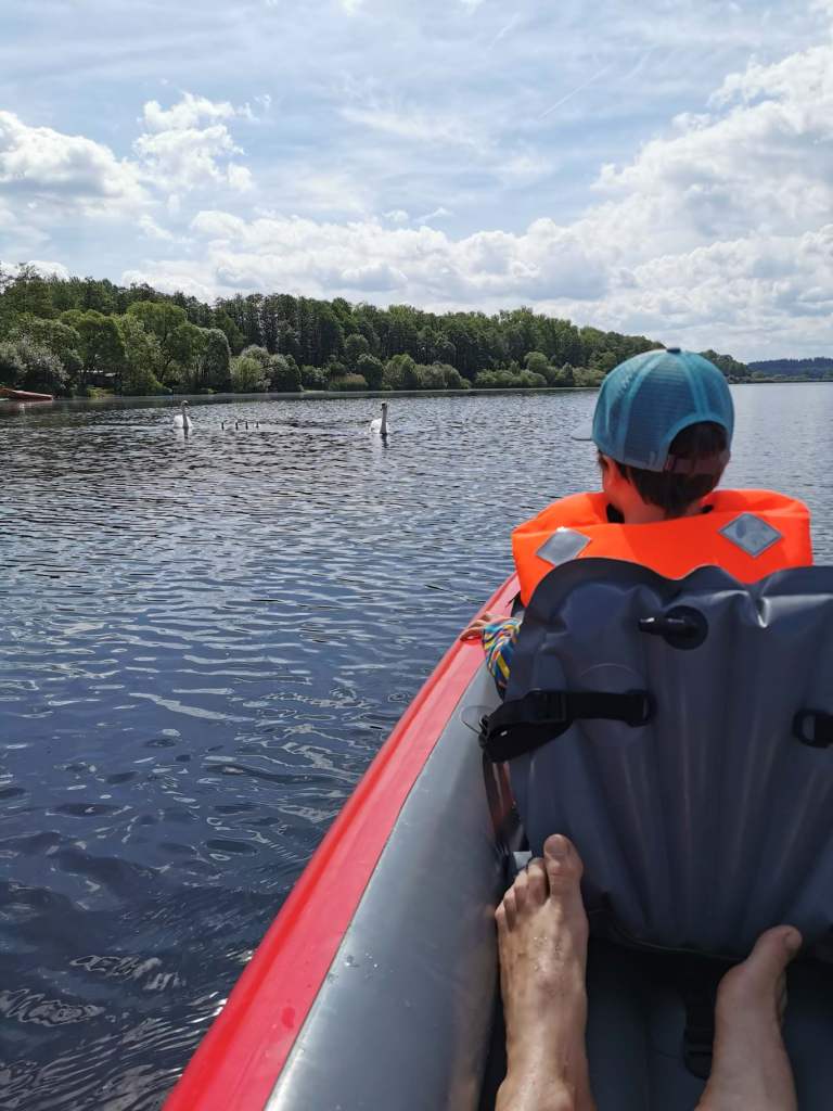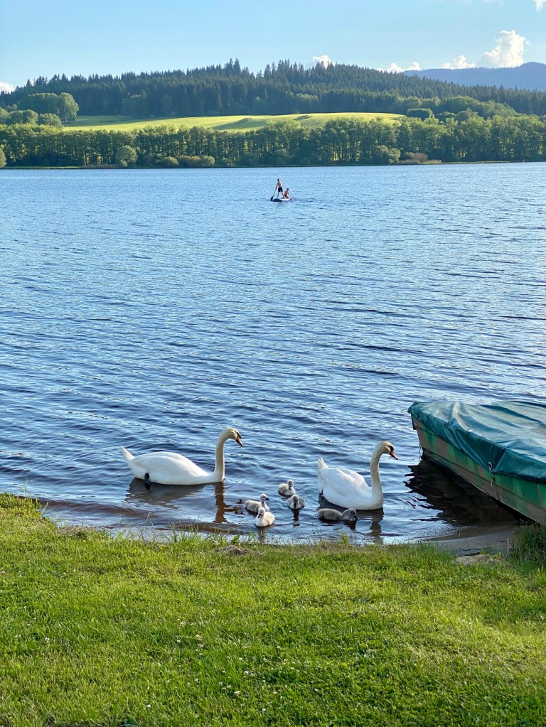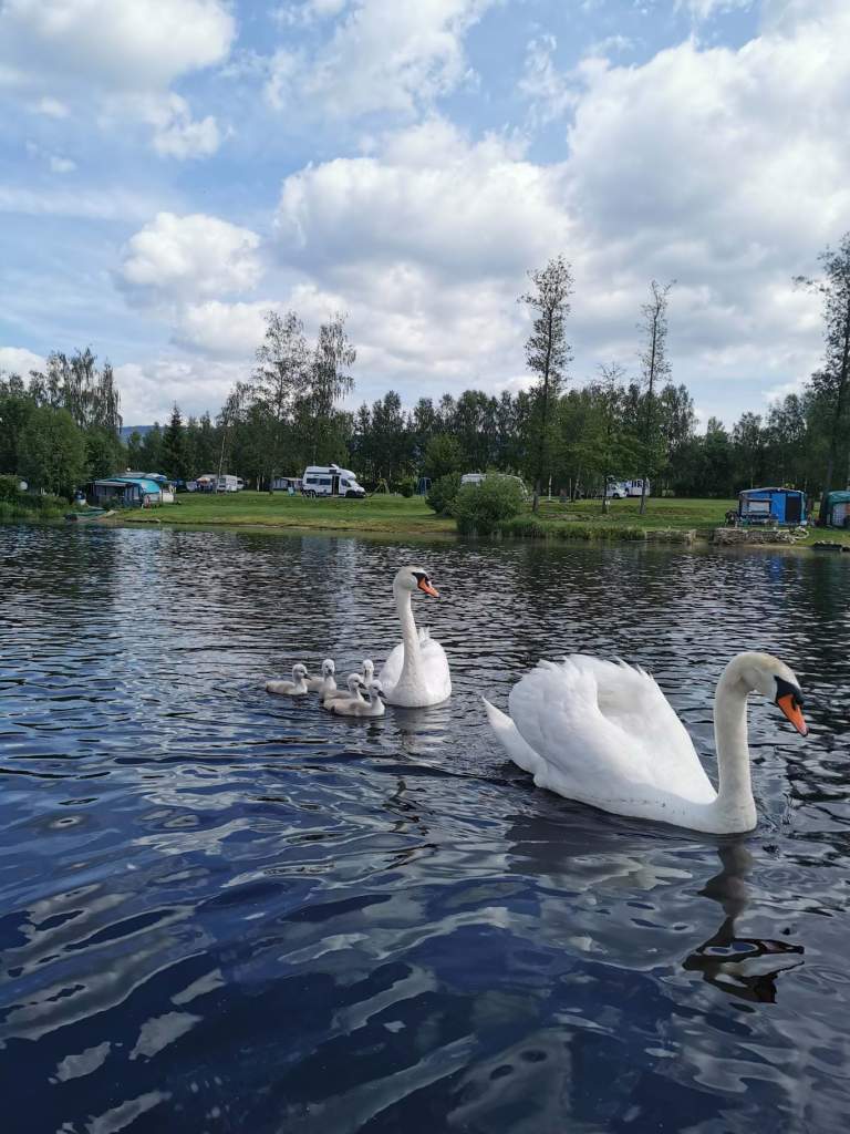 Perfekt. Als wir ankommen ist der See noch sehr aufgewühlt und wellig von einem vorhergegangenem Unwetter, am nächsten Morgen jedoch herrlich glatt. Es ist sonnig, aber nicht zu heiss. Eine siebenköpfige Schwanenfamilie kommt mehrmals vorbei und grast auf der Wiese und Johannes freundet sich mit einem älteren Herrn an, der Dauercamper auf dem Platz ist und seine Parzelle direkt am Ufer für die Saison startklar macht.