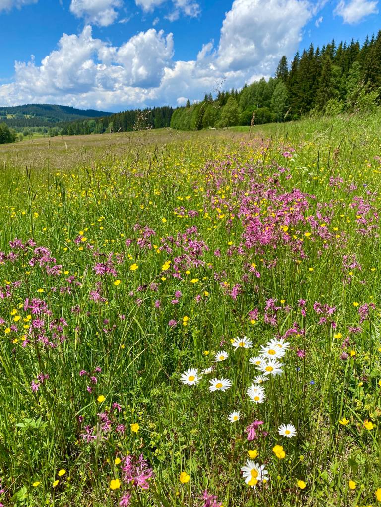 Unterwegs weiter in Richtung Stausee und fast immer an der schönen Moldau entlang, fahren wir durch wunderbar unberührte Natur und Blumenwiesen, wie es sie bei uns gar nicht mehr gibt. Da bleiben wir spontan stehen zu einer Kaffee- und Genießerpause.