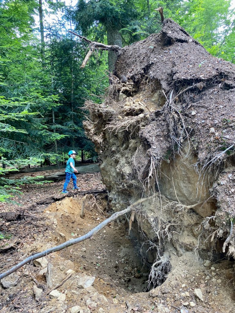 Vor zwei Wochen hat ein Unwetter viele Bäume umgeworfen und ein paar Wegabschnitte sind noch gesperrt. Es ist angenehm kühl im Wald und Elena will viel selber gehen. So kommen wir nicht unbedingt schnell voran, aber das macht ja auch nichts.