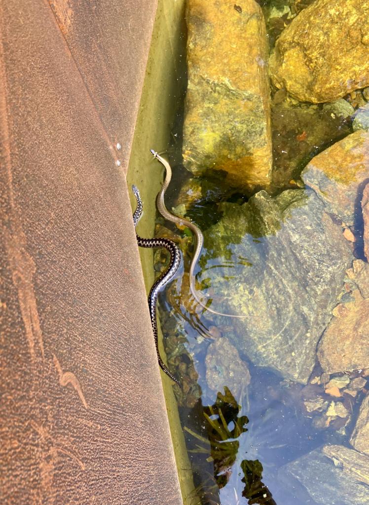Tiere sehen wir nicht so arg viele, aber immerhin den Bären können wir sogar recht nah beobachten. Aber kein Luchs, Wolf, Elch, Wildschwein, Hirsch oder Otter mag sich zeigen. Naja. Der Weg ist das Ziel und bis wir wieder am Bus sind, sind tatsächlich fünf (!) Stunden vergangen, in denen wir nie so richtig Pause gemacht haben. Nur mal kurz stehen geblieben und sämtliche Vorräte nach und nach aufgegessen, aber nie mal an nen Tisch gesetzt oder so. Wir sind richtig müde alle. Die Spanier haben sich ab dem letzten Drittel via Abkürzung verabschiedet, wir wollen aber noch die Kurve ausgehen und kommen so noch zu den Schlangen, wo wir immerhin zum ersten Mal eine Kreuzotter sehen, die mit einer Ringelnatter ein Gehege teilt.