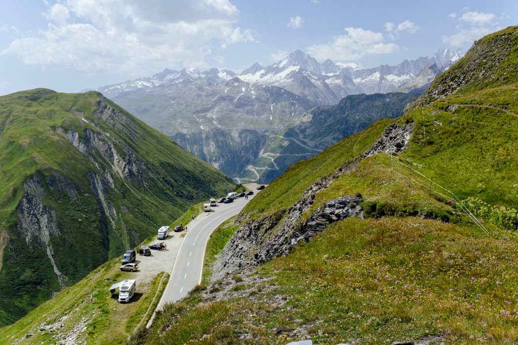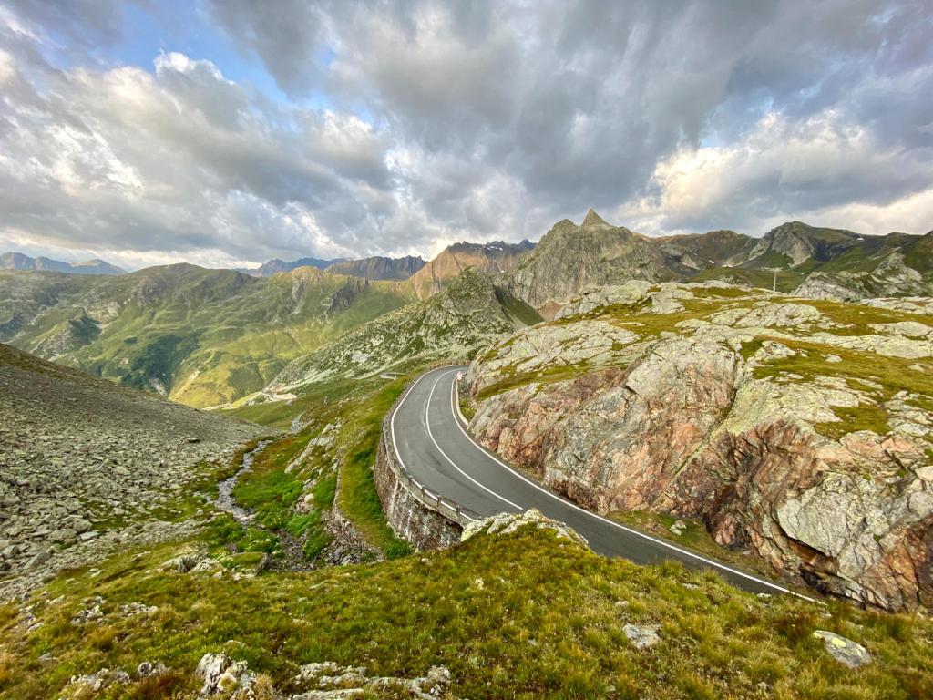 Weiter ging es dann am nächsten Tag über zwei spannende neue Passstraßen: erst über den Oberalppass und dann über den recht berühmten Furkapass: „Der Furkapass ist mit 2436 m ü. M. der vierthöchste Pass der Schweiz. Die kunstvoll angelegte Strasse wurde auch schon von Sean Connery als James Bond in «Goldfinger» befahren.“ Wenn man einen kleinen steilen Spaziergang oben auf dem Pass macht, hat man eine super Aussicht rüber zum Grimselpass, den wir in einem anderen Urlaub bereits bei echt miesem Wetter gefahren sind.