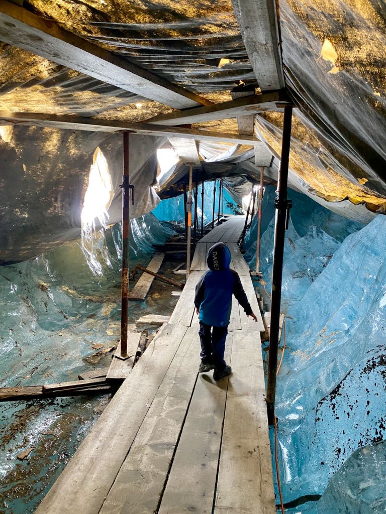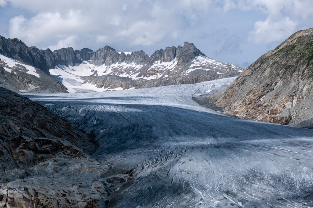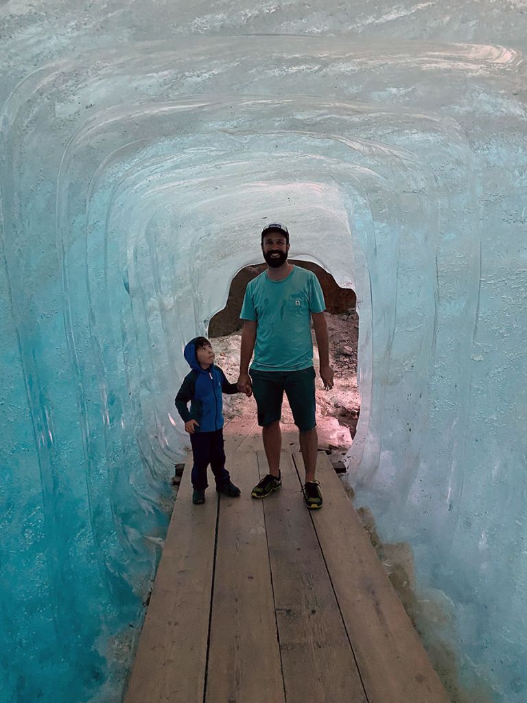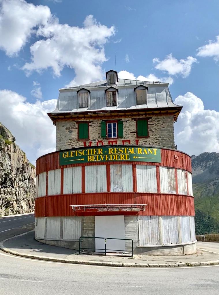 Kurz unterhalb der Passhöhe erreicht man dann einen ziemlich berühmten Ort, das geschlossene Hotel Belvédère, gegenüber vom Rhonegletscher, bzw. den Resten davon. Jedes Jahr wird dort ein Tunnel ins Eis geschlagen, der aber leider im August schon ziemlich geschmolzen ist. Trotzdem wollen wir die sogenannte Eisgrotte sehen und waren von der gesamten Kulisse schwer beeindruckt.