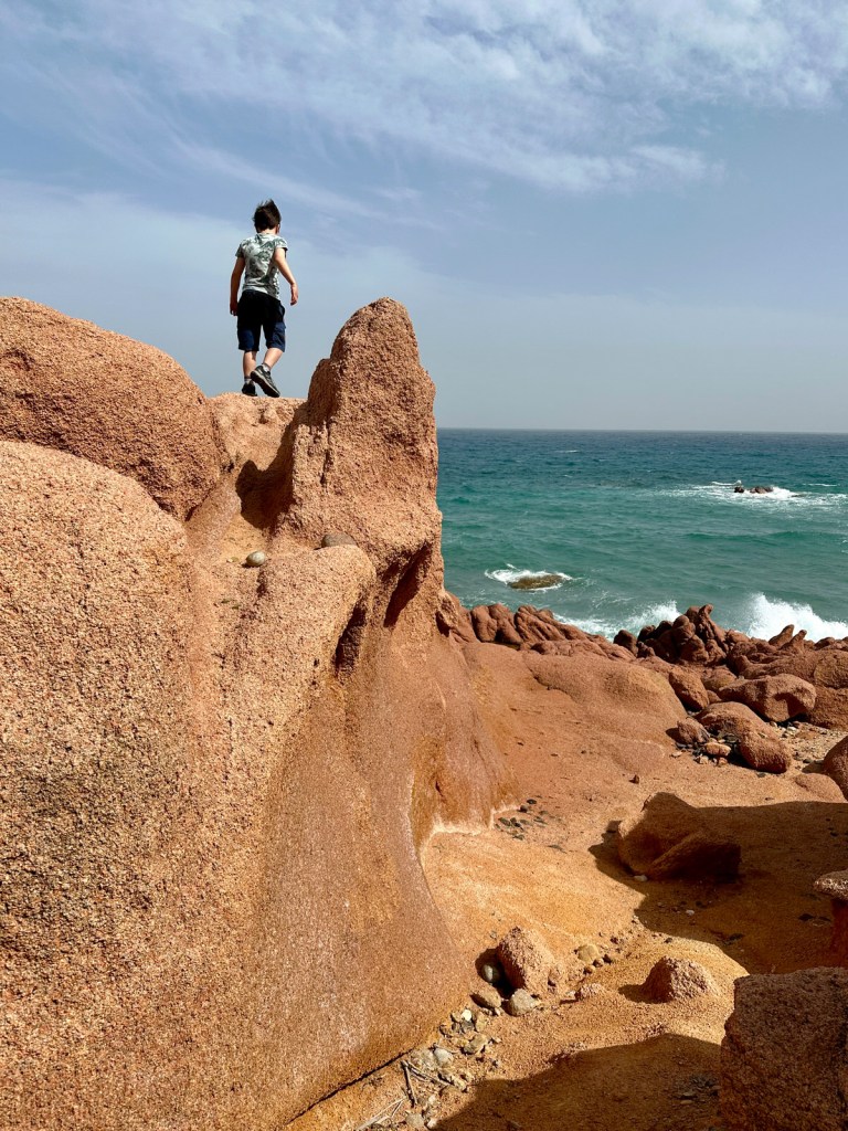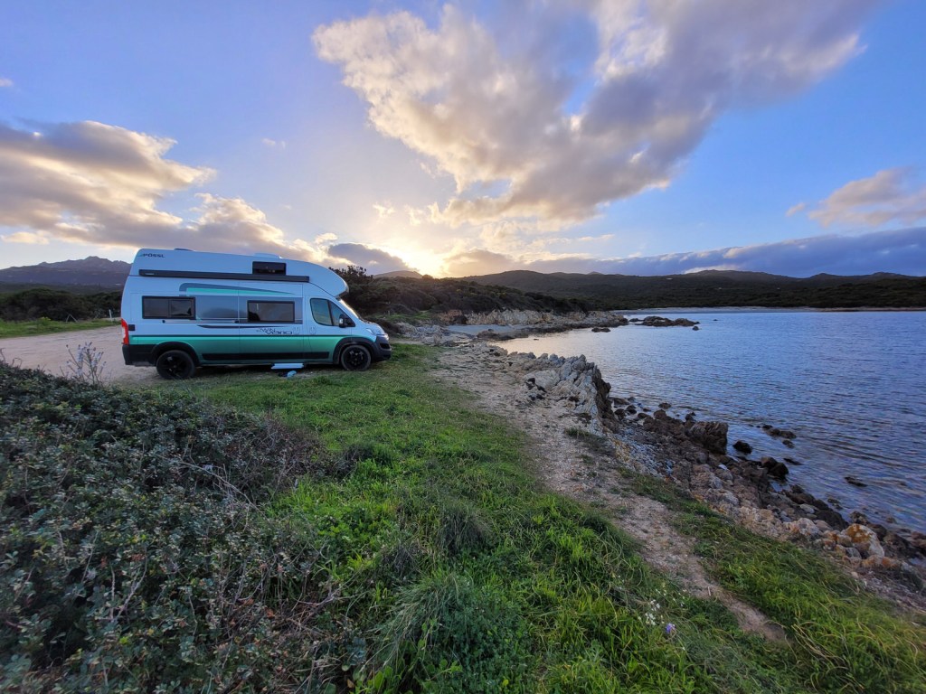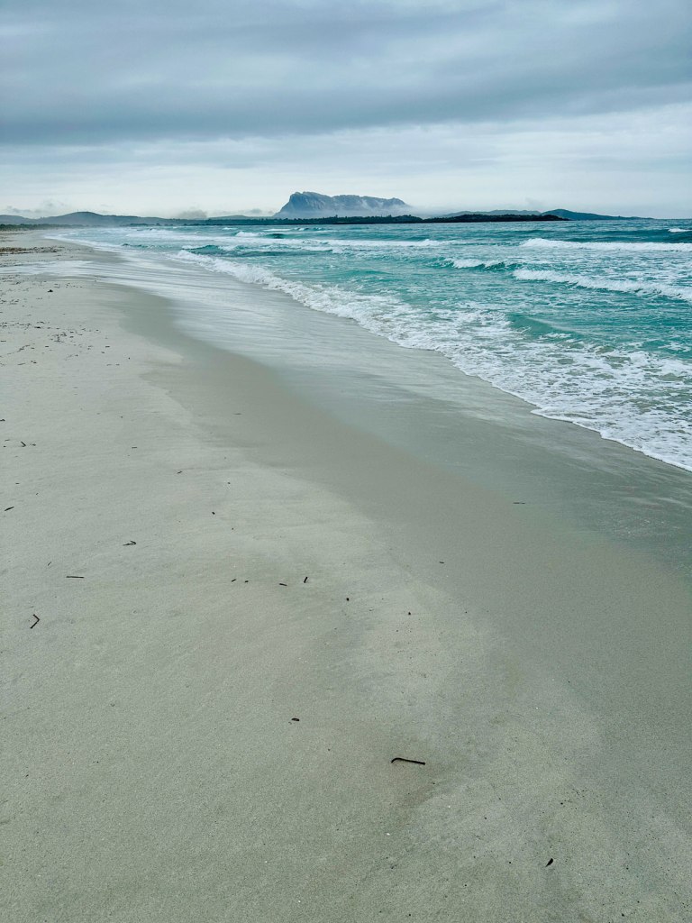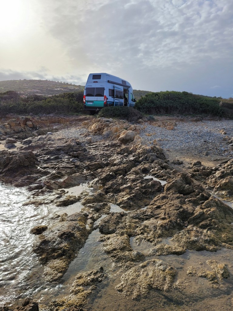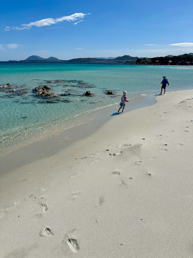 Mit knapp einer Stunde Verspätung fuhren wir um kurz vor 9 Uhr morgens bei Sonne und Wind in Olbia von der Fähre. Simon hatte kürzlich bei Insta einen tollen Spot gesehen, den wir 20 Minuten später schon erreichten und erst mal ganz für uns allein hatten. Ein traumhafter weißer Sandstrand und einige Kletterfelsen nebendran samt kleiner windgeschützter Bucht und sogar ein kleiner Küstenwanderweg, auf dem man noch zwei Strände weiter wandern kann. Hier bleiben wir den ganzen Tag, sammeln Muscheln und Steinchen, trinken Tee (3 von 4 sind recht erkältet), lesen und genießen das Angekommensein auf der Insel. So kann’s gerne weitergehen.
