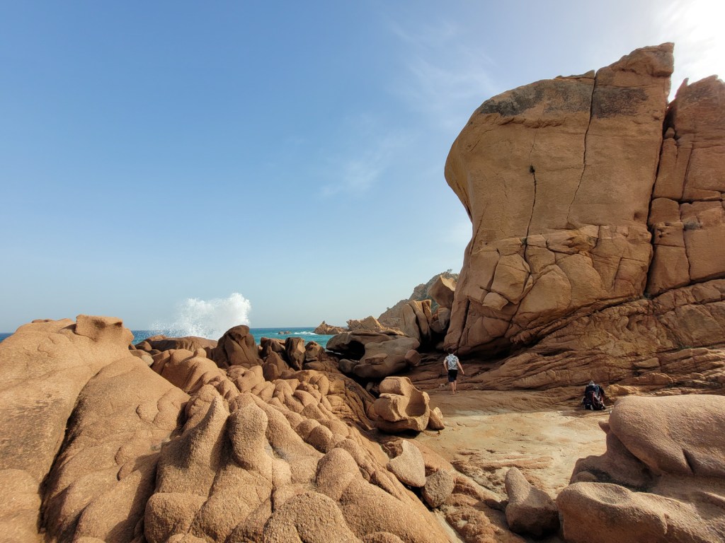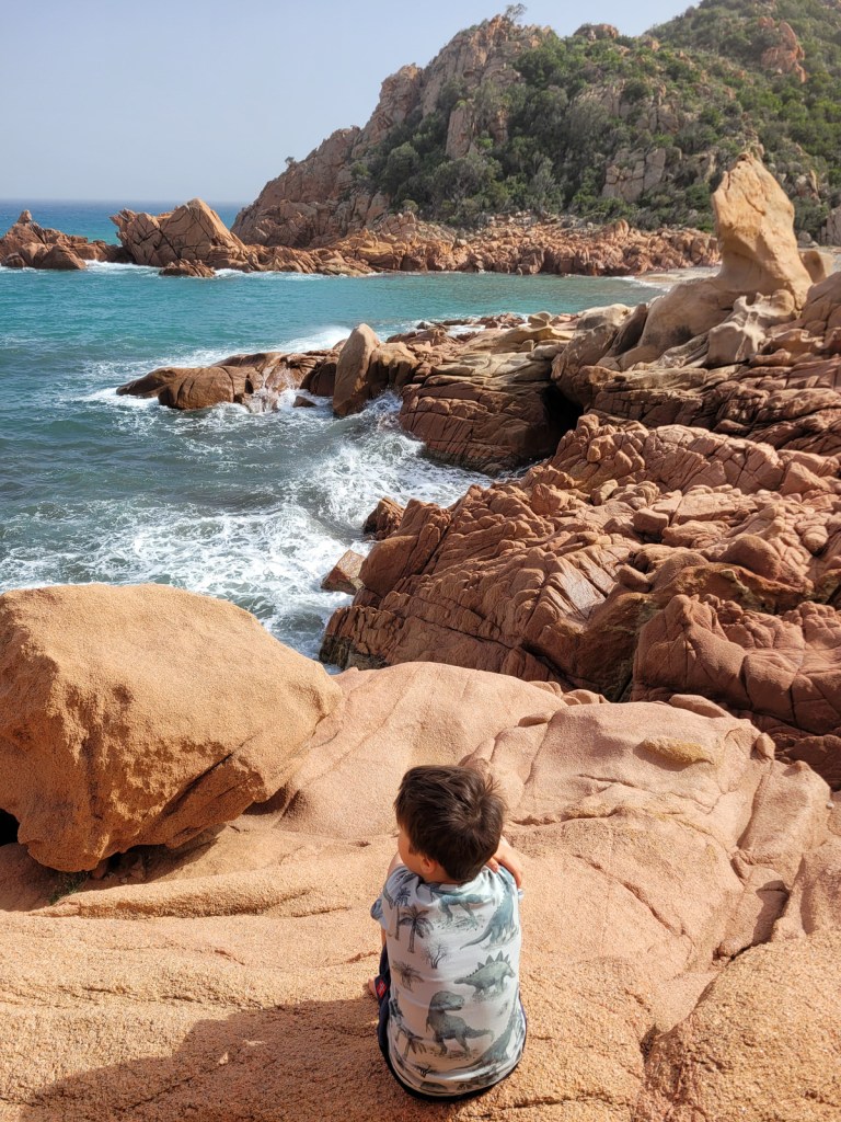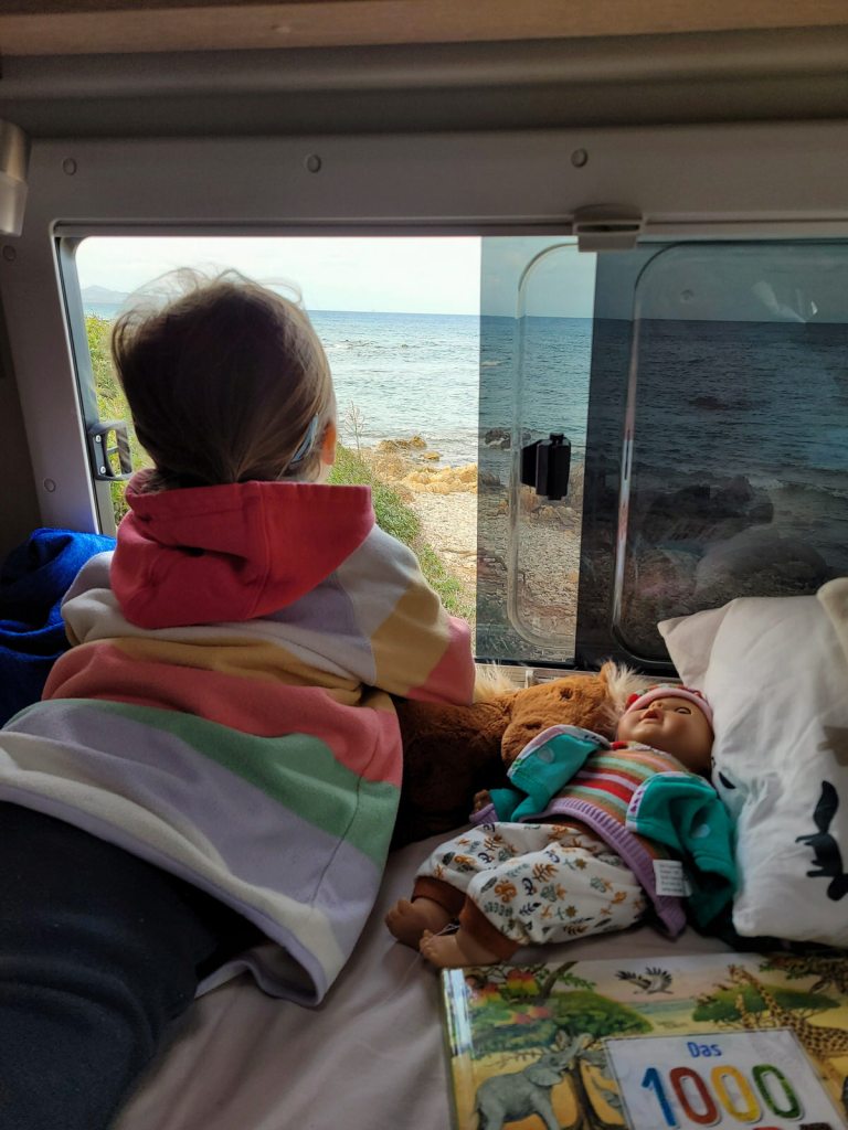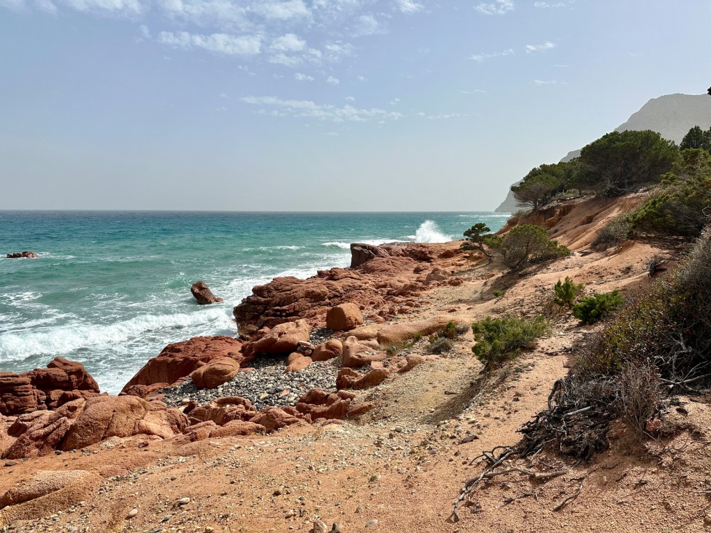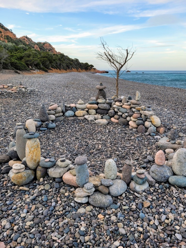 Mit knapp einer Stunde Verspätung fuhren wir um kurz vor 9 Uhr morgens bei Sonne und Wind in Olbia von der Fähre. Simon hatte kürzlich bei Insta einen tollen Spot gesehen, den wir 20 Minuten später schon erreichten und erst mal ganz für uns allein hatten. Ein traumhafter weißer Sandstrand und einige Kletterfelsen nebendran samt kleiner windgeschützter Bucht und sogar ein kleiner Küstenwanderweg, auf dem man noch zwei Strände weiter wandern kann. Hier bleiben wir den ganzen Tag, sammeln Muscheln und Steinchen, trinken Tee (3 von 4 sind recht erkältet), lesen und genießen das Angekommensein auf der Insel. So kann’s gerne weitergehen.