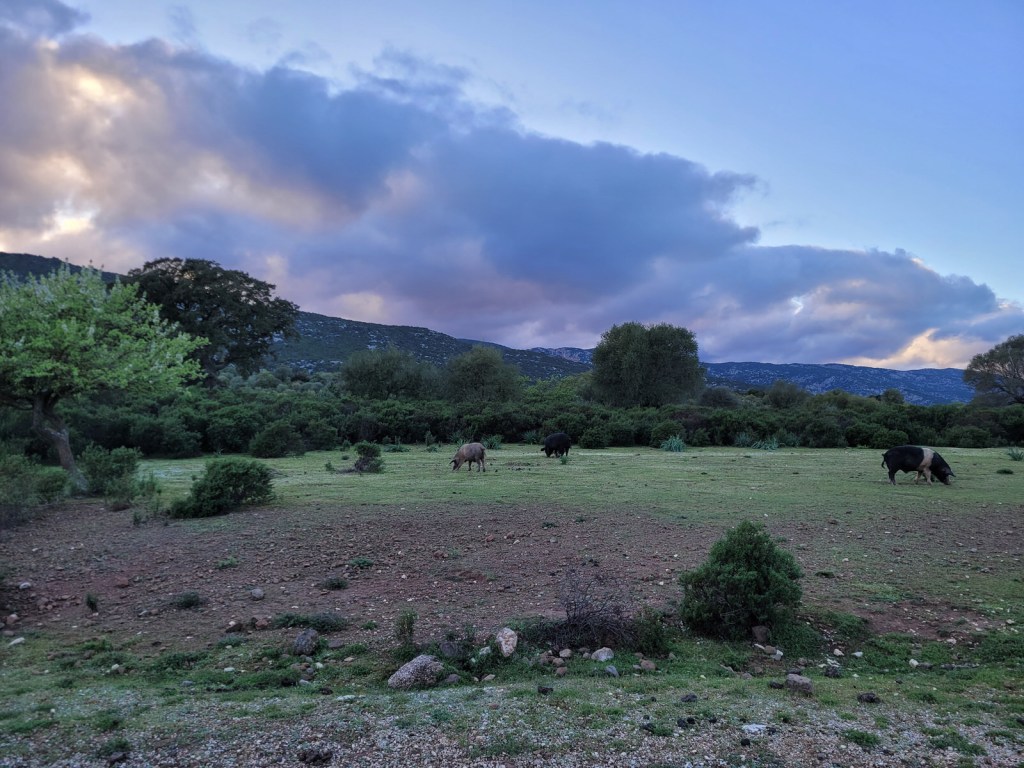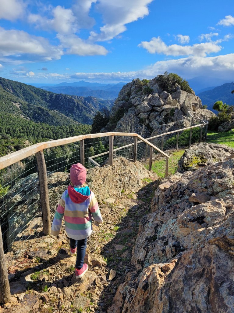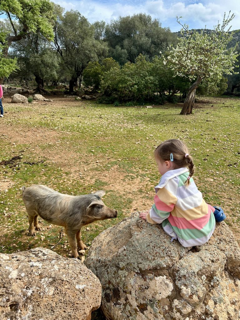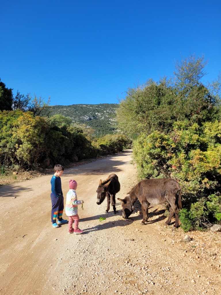 Einen Zwischenstopp machen wir am Monte Lopena, wo wir kurz hochlaufen und sogar einen Regenbogen sehen, bevor es weiter geht bis Baunei, von wo aus wir uns in ein paar sehr engen und steilen Serpentinen hochkämpfen auf ein Hochplateau, wo wir wieder eine mini Wanderung machen wollen. Aber erst mal Esel streicheln! Überall laufen hier Esel, Schweine und Kühe rum. Wir sind dann nur die erste kleine Schlaufe der Wanderung gelaufen. Die Kinder fanden besonders den Ausblick in das sehr tiefe Karstloch spannend. Zum Glück war es mit einem Zaun gesichert und man konnte von einer Art Balkon hinunterschauen. Mir wird es da trotzdem immer ganz anders. Es ist wohl das tiefste Karstloch Europas mit 270m Tiefe.