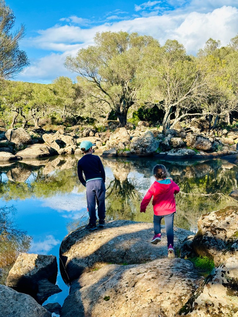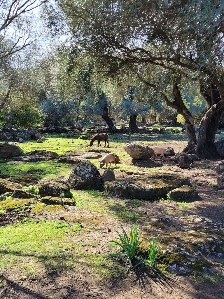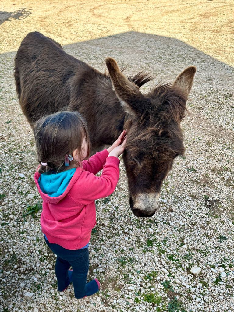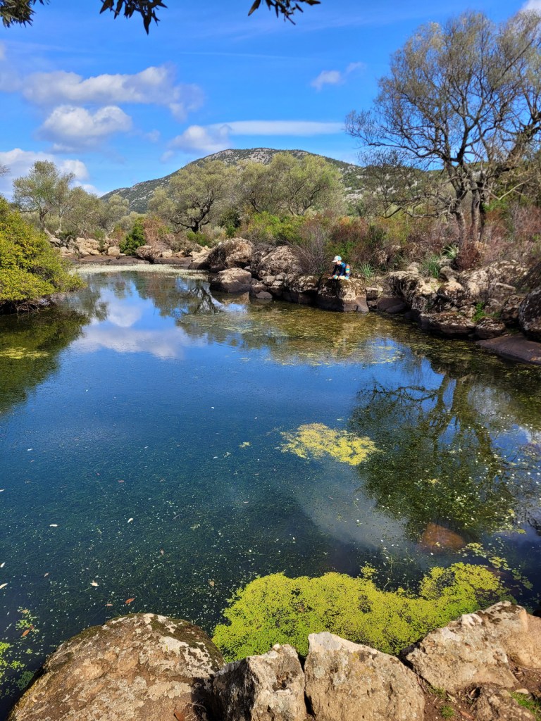 Einen Zwischenstopp machen wir am Monte Lopena, wo wir kurz hochlaufen und sogar einen Regenbogen sehen, bevor es weiter geht bis Baunei, von wo aus wir uns in ein paar sehr engen und steilen Serpentinen hochkämpfen auf ein Hochplateau, wo wir wieder eine mini Wanderung machen wollen. Aber erst mal Esel streicheln! Überall laufen hier Esel, Schweine und Kühe rum. Wir sind dann nur die erste kleine Schlaufe der Wanderung gelaufen. Die Kinder fanden besonders den Ausblick in das sehr tiefe Karstloch spannend. Zum Glück war es mit einem Zaun gesichert und man konnte von einer Art Balkon hinunterschauen. Mir wird es da trotzdem immer ganz anders. Es ist wohl das tiefste Karstloch Europas mit 270m Tiefe.