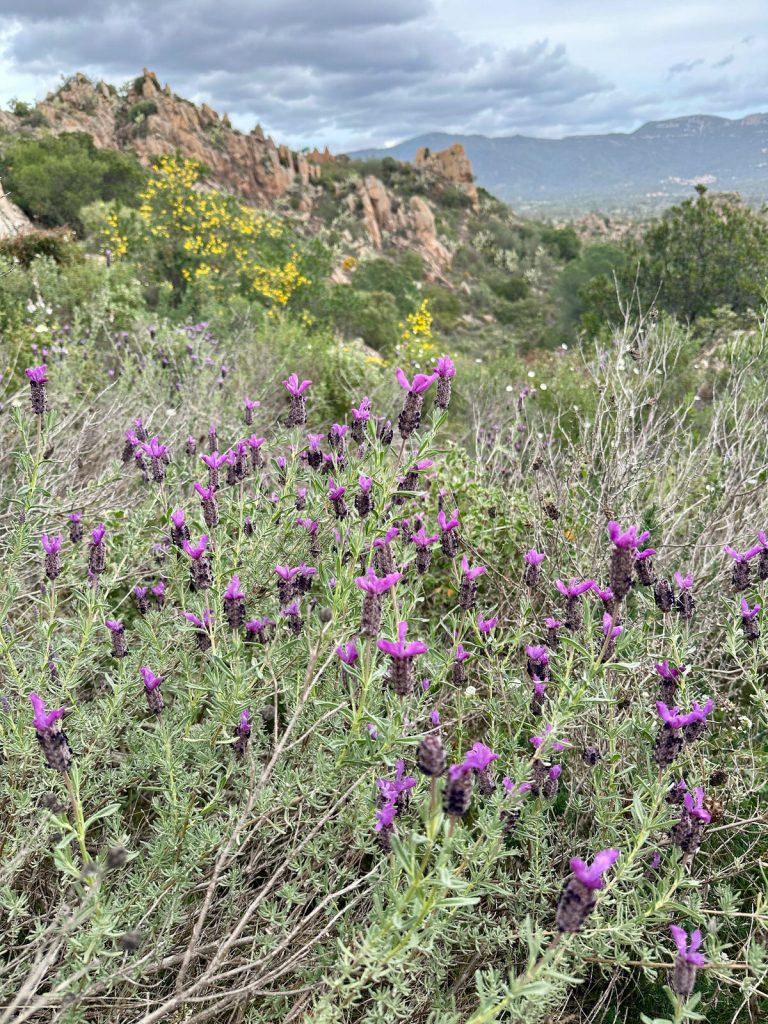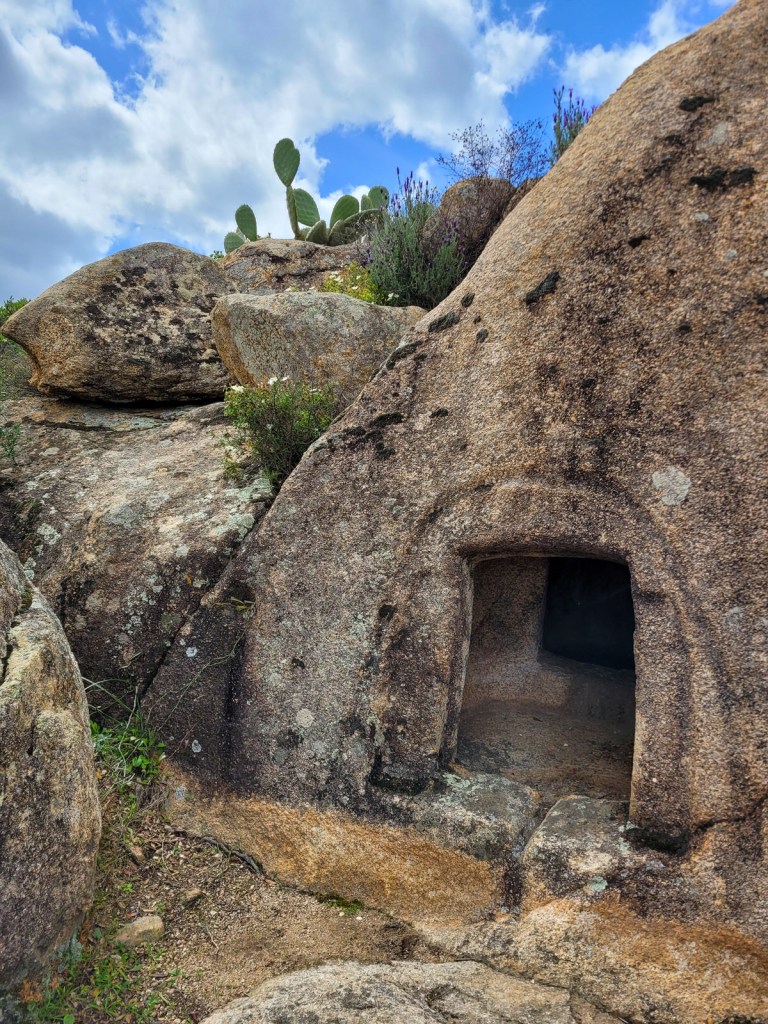 Am späten Vormittag fahren wir weiter bis Lotzorai, wo wir in der Nähe zu einer sehr alten Steinsiedlung aus der Bronzezeit wollen und uns sehr freuen, dass das Gelände frei zugänglich ist. Da E eingeschlafen ist, gehe ich mit J vor und erkunde das Gebiet, das mit Heckenrosen und Lavendel überall erblüht. Die Weglein sind ziemlich zugewachsen und unsere kurzen Hosen bereuen wir schnell mit schlimmen Kratzern an den Beinen. Aber die 15 in Stein gehauenen Höhlen? Gräber? Sind wirklich spannend und J saust nur so durch die Gegend. E und Simon treffen wir dann auch noch, die später gestartet sind und einen größeren Teil dann weglassen.