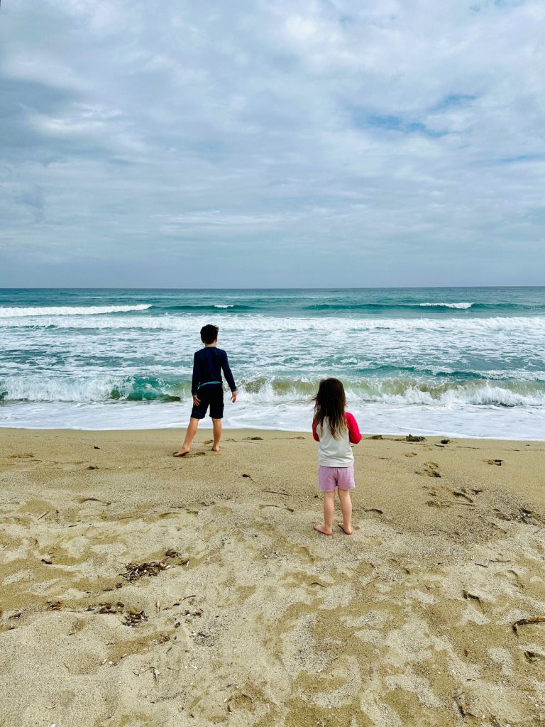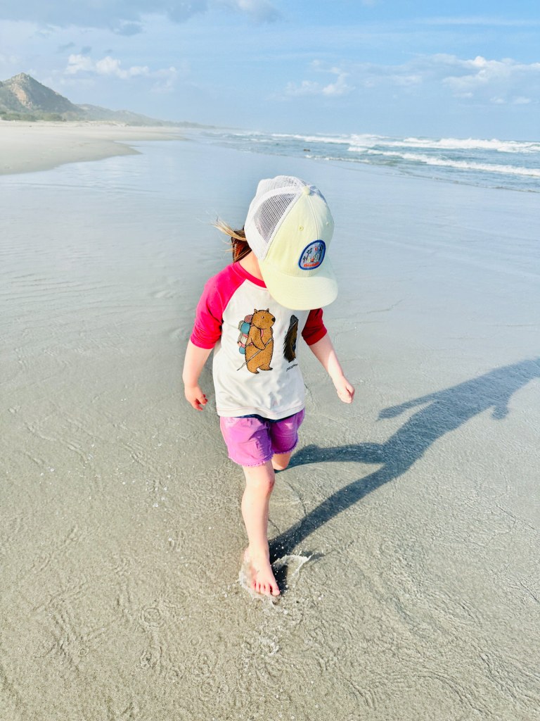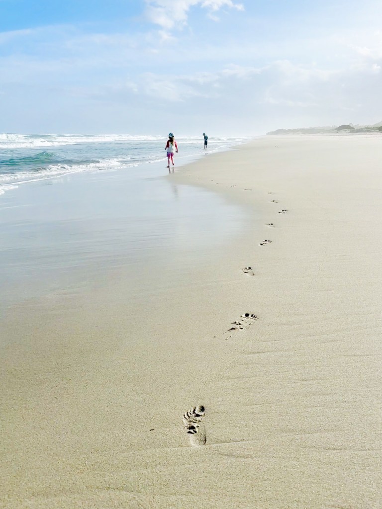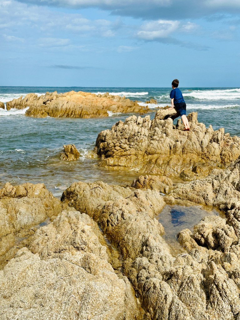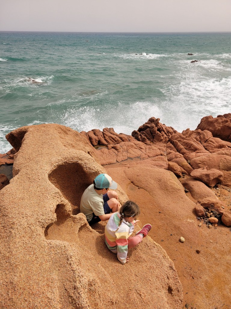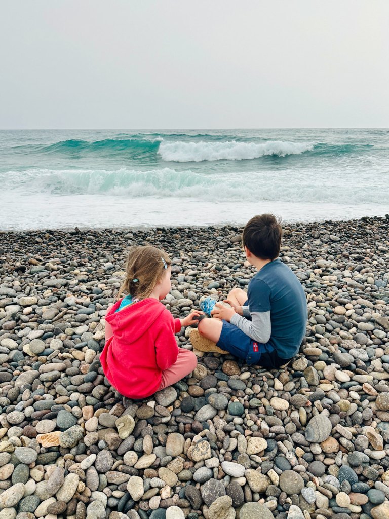 Wir verbringen zwei gemütliche Tage auf dem Campingplatz und freuen uns über die hohen und lauten Wellen am Kieselstrand. Wir spazieren zu den roten Kletterfelsen, wo ich dann mit E umdrehe und J mit Simon noch weitergeht. J lernt am Spielplatz ein nettes Mädchen kennen und die treffen sie auch auf der Wanderung nochmal.
