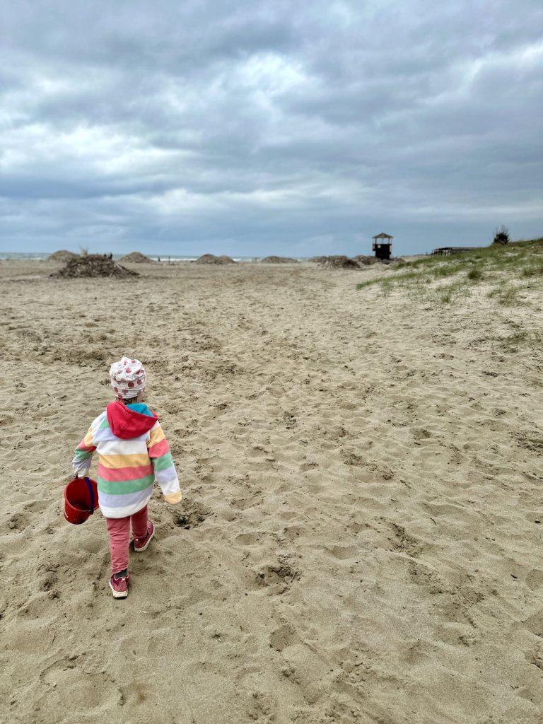 J buddelt im Sand, findet einen Freund und wir fahren erst gegen vier Uhr weiter in Richtung Campingplatz Coccorocci, wo wir um viertel nach fünf ankommen, endlich unsere Müllberge loswerden und noch einen guten Platz in Spielplatz- und Strandausgangsnähe finden, wo wir für die nächsten drei Tage unsere Base aufbauen. Den Campingplatz Coccorocci haben wir bei unserer Elternzeitreise 2021 entdeckt und das Geräusch, das das Meer macht, wenn es die Kiesel am Strand rollt, ist einfach so schön. 🤩 Außerdem macht es riesigen Spaß, die perfekten Steine für den Garten zu Hause zu suchen und möglichst so einzupacken, dass Simon es nicht merkt. 🤣