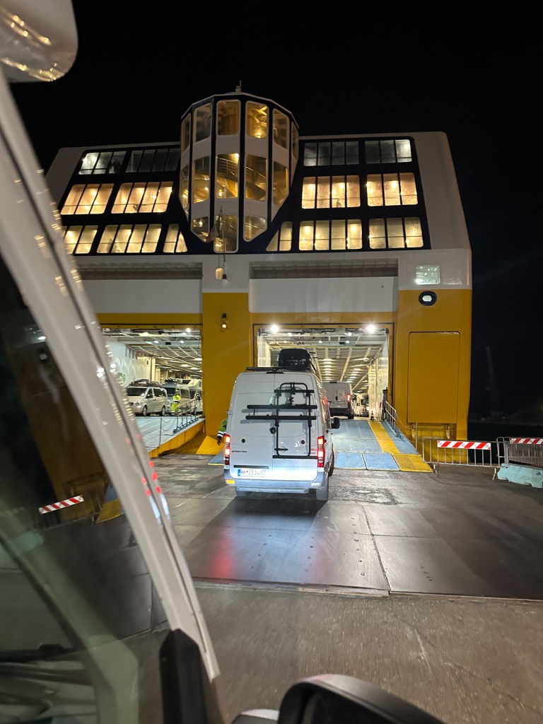 In der Nacht wurde es dann aber besser und ein sonniger aber windiger Tag erwartete uns in Sardinien. Das erste Cornetto und Cappuccino gabs noch an Bord bevor wir anlegten. Irgendwie hatten wir uns aber ein falsches Parkdeck gemerkt und sind dann viel zu spät runter, nämlich erst als wir ausgerufen wurden und so durften wir dann unten im Schiff wenden, weil das andere Parkdeck schon heruntergelassen worden war. 🫣 Einziges Womo weit und breit auf der Seite – wenn es nicht so pressiert hätte, wäre das sicher ein cooles Foto gewesen…
